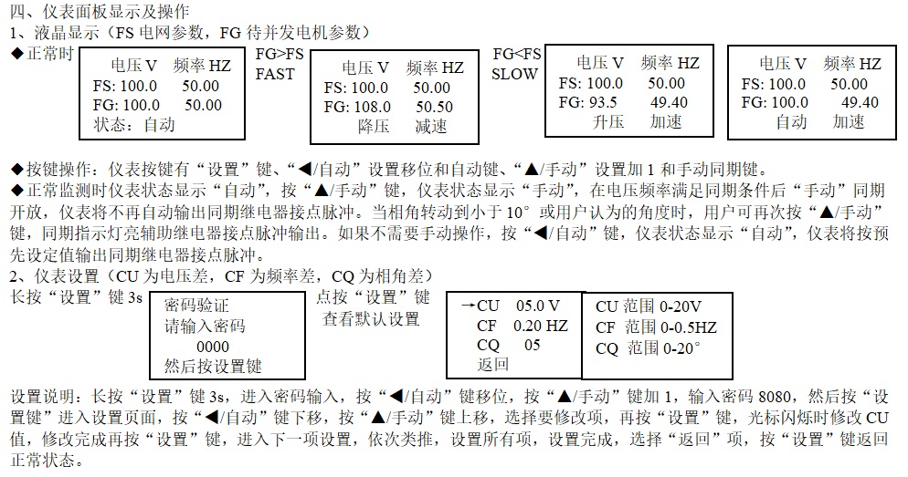 ◆當(dāng)待并聯(lián)發(fā)電機的電壓和頻率大于電網(wǎng)的電壓和頻率時,液晶顯示狀態(tài)“降壓 減速”,如果小于電網(wǎng)的電壓和頻率時,液晶顯示狀態(tài)“升壓 加速”。
