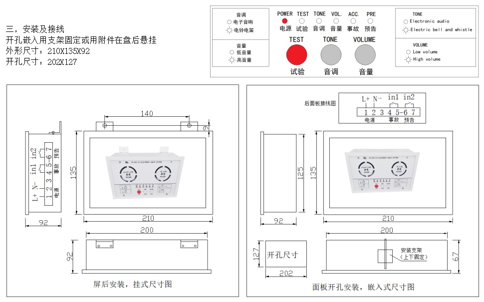 指示燈:6個LED指示,電源、試驗、音調、音量、事故、預告